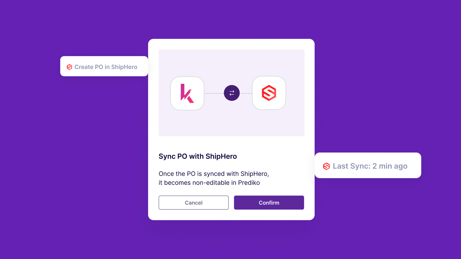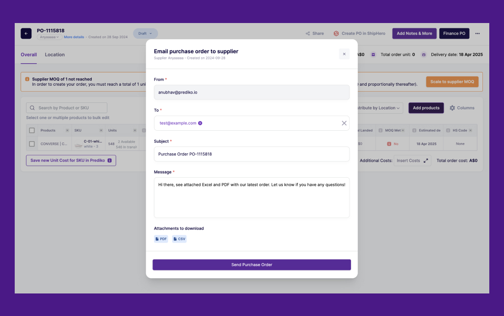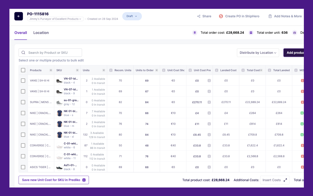 Due to its strong integrations with ShipHero, Prediko facilitates real-time syncing of purchase orders, allowing you to allocate units of stock from incoming purchase orders to be sold immediately.