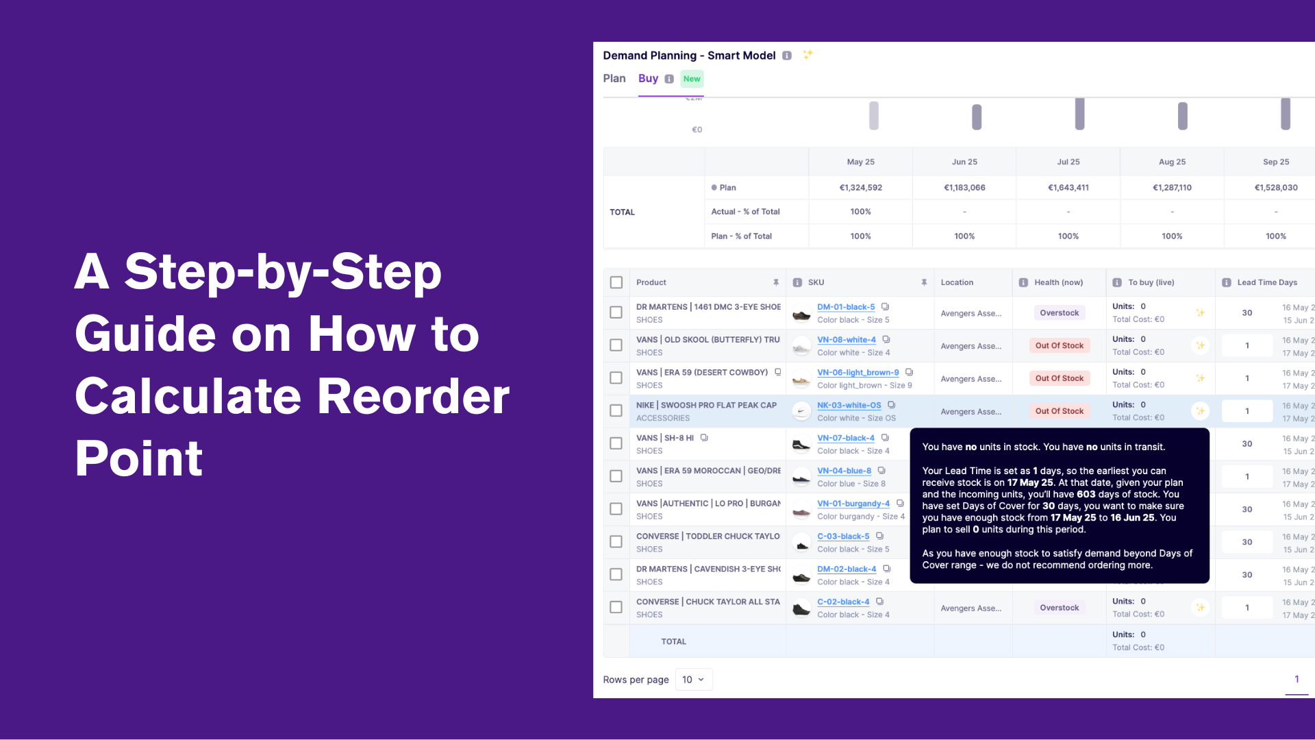 - Automated replenishment suggestions: Receive smart “Buy Now” recommendations for finished goods and raw materials for up to one year based on forecasted demand, lead times, and safety stock levels.