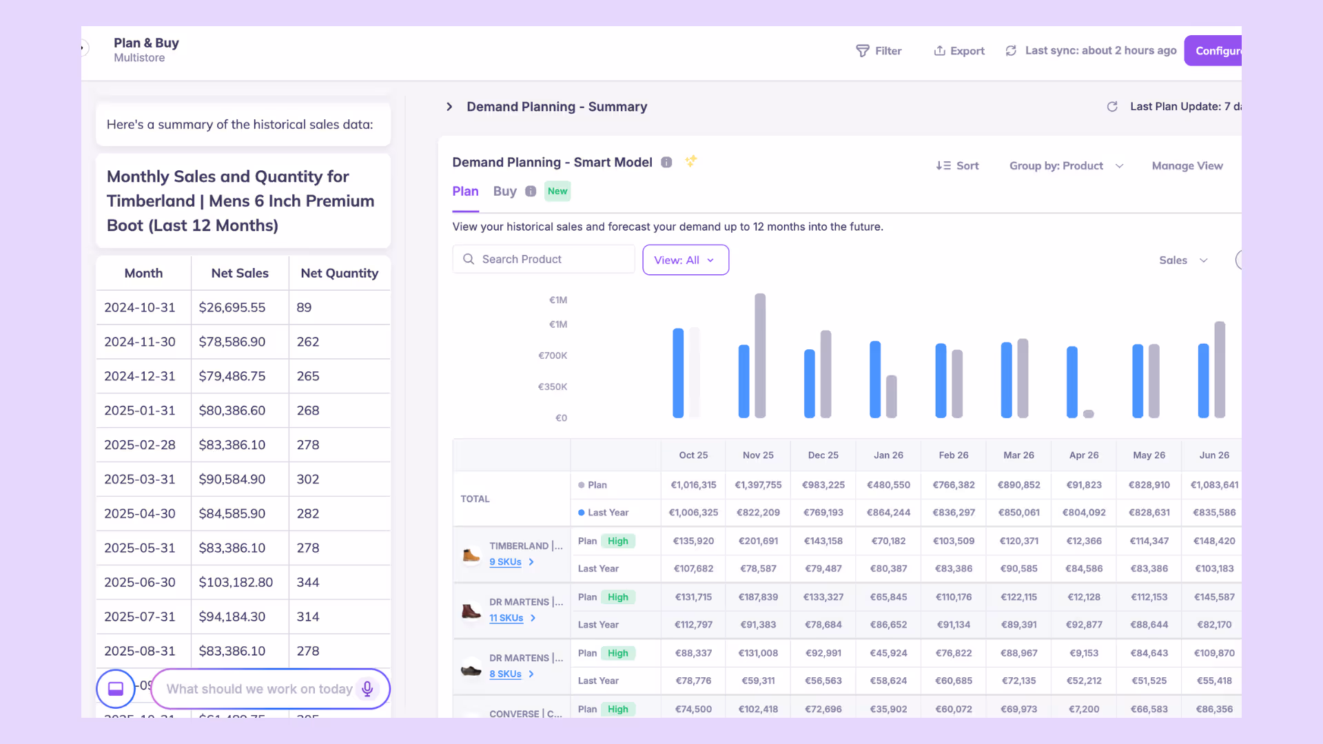 It even considers bundle or BOM demand to calculate total material needs. This places it among the most powerful AI demand planning tools available to fast-growing Shopify brands. You can adjust forecasts manually, run “what-if” scenarios, and review insights on which SKUs need attention, all through simple chat commands.