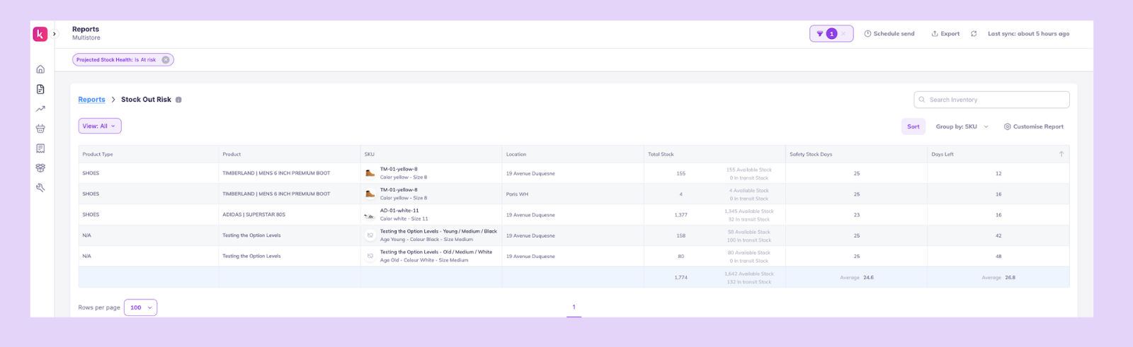 What it includes: Â SKU, Location, Total stock, Safety stock days, and Days left.Â