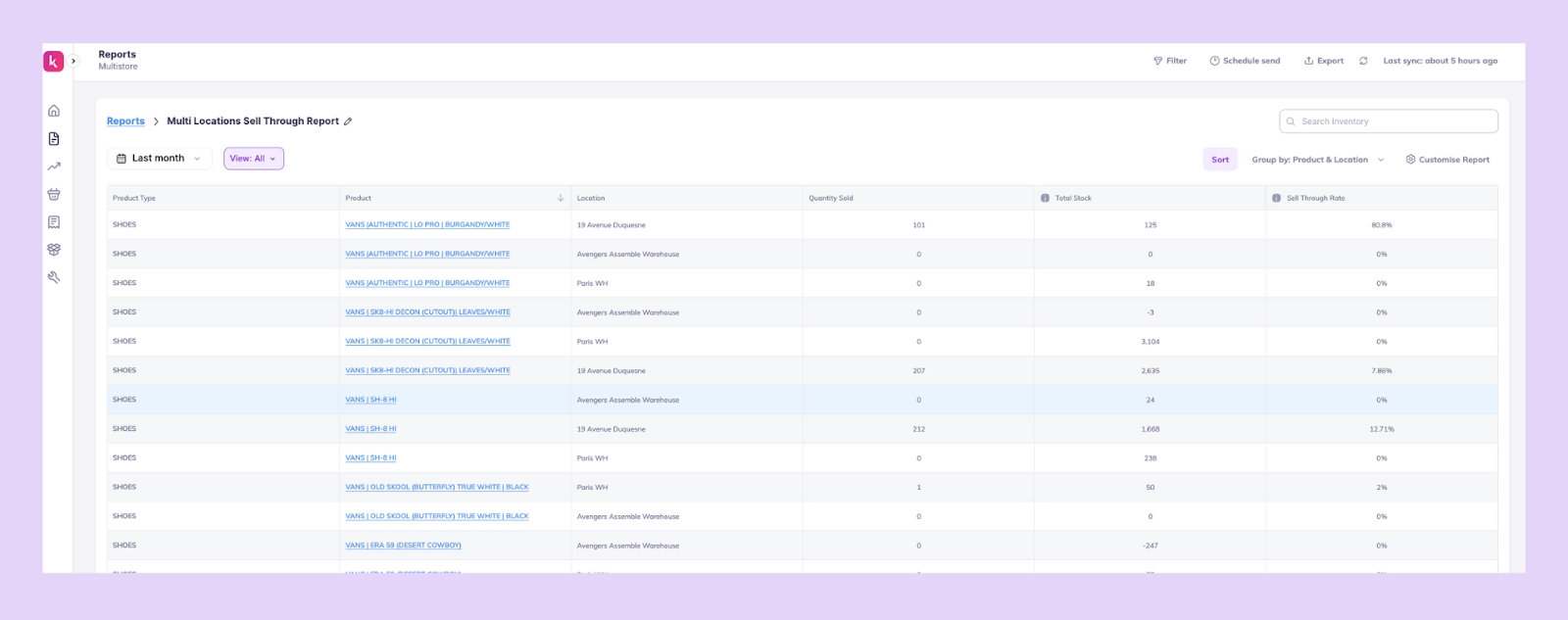 What it includes: Product, Location, Quantity sold, Total stock, and Sell-through rate.Â
