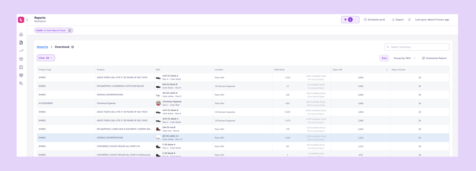 What it includes: SKU, Location, Total stock, Days left, and Days of cover.Â