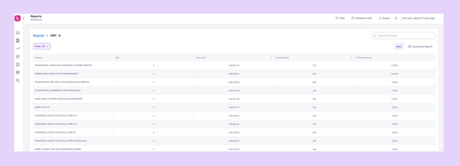 What it is: This report is a classification of SKUs into A, B, and C categories based on contribution to revenue, demand consistency, or profitability, automatically refreshed by AI as patterns change.
