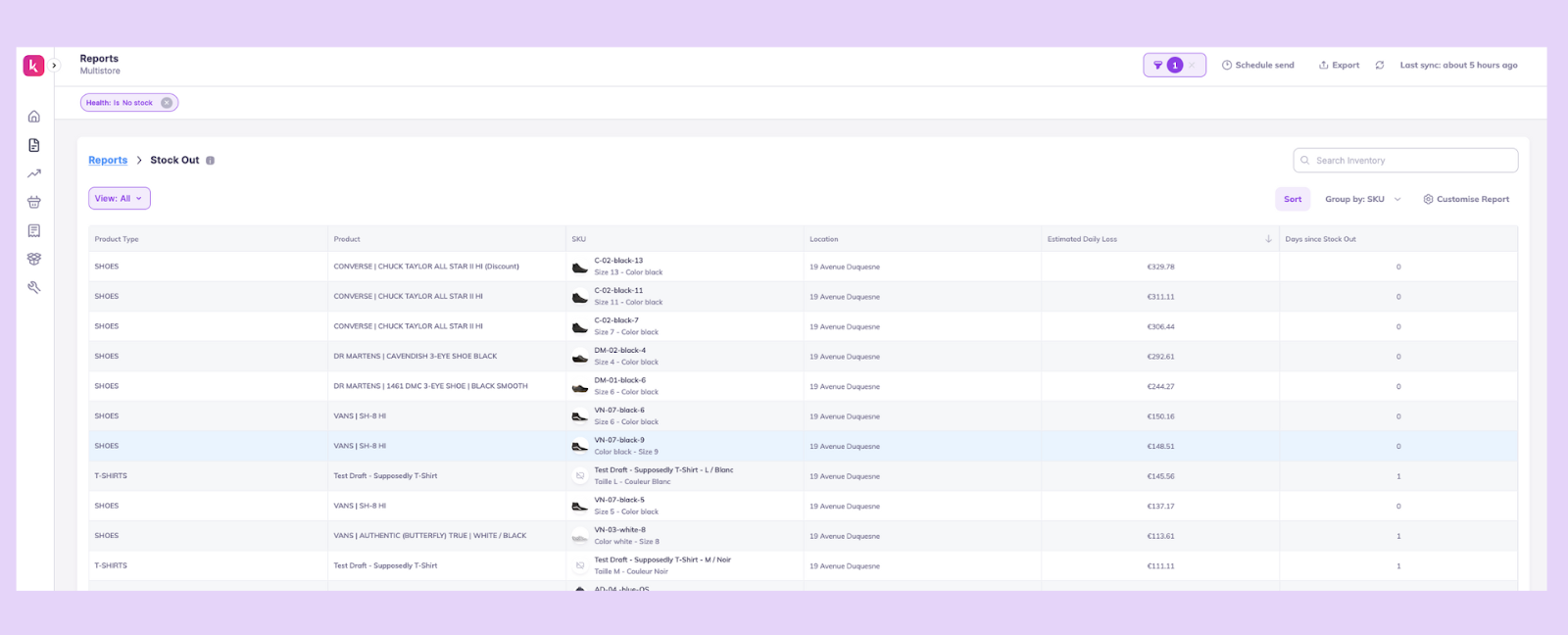 What it includes: SKUs at 0, Location, Days since stock out, and Estimated daily loss.