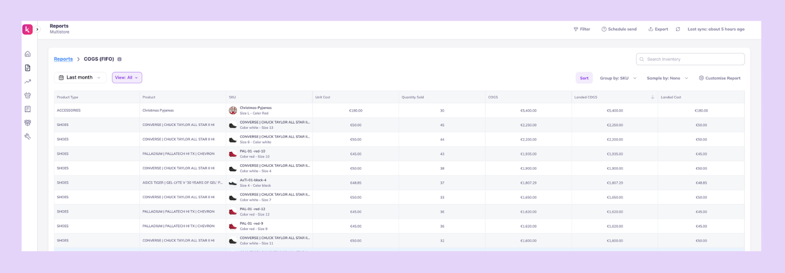 What it includes: SKU, Unit cost, Quantity sold, COGS, Landed COGS, and Landed cost.