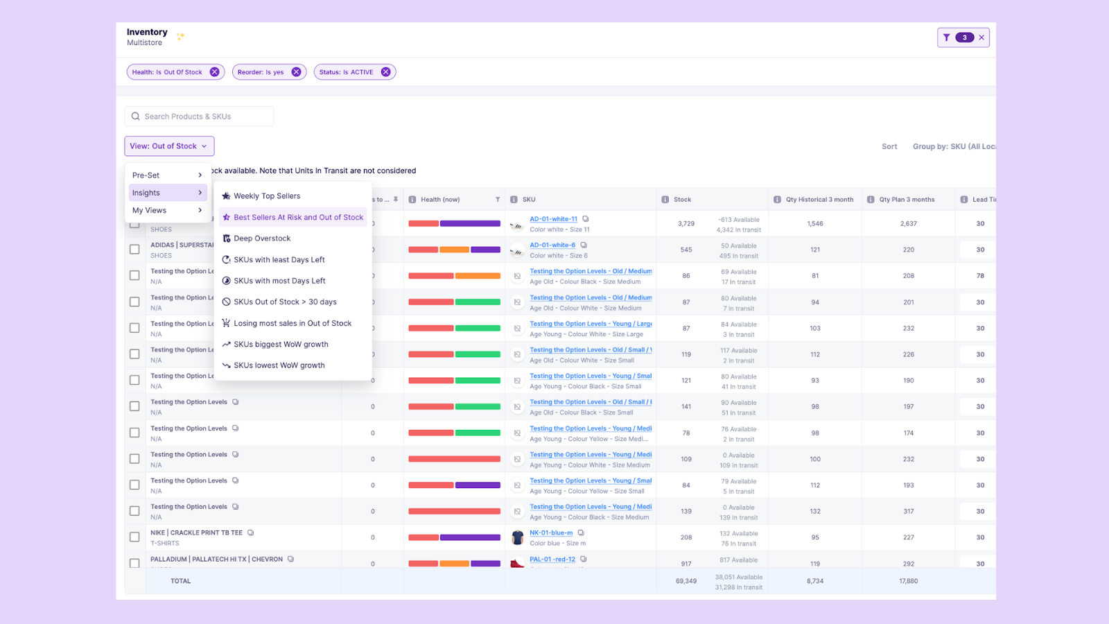 How it helps: Shows where stock is stuck or moving too fast, helping you transfer or restock, avoid localized stockouts, and optimize fulfillment decisions.