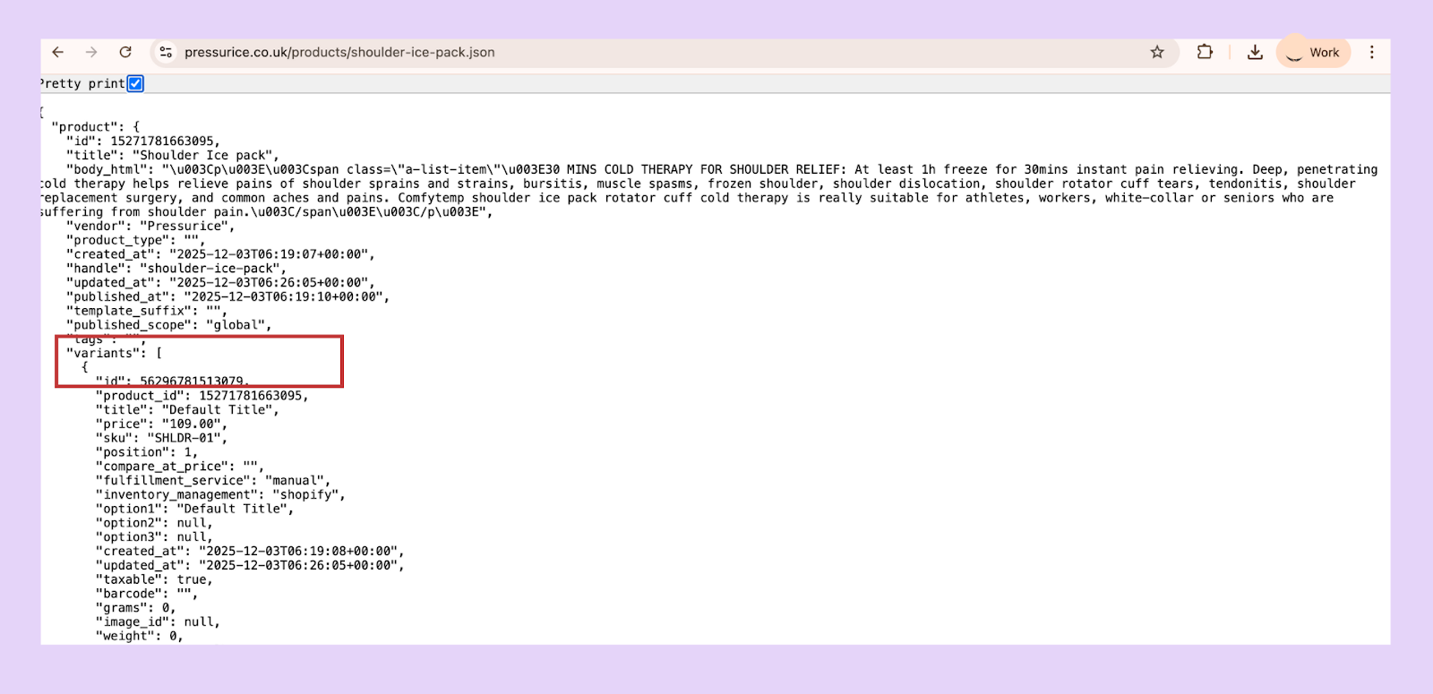 A product ID identifies the parent product in Shopify’s database, while each variant has its own variant ID. You can find a variant’s ID by clicking the variant in the product details page and looking at the URL – the number after /variants/ is the variant ID.