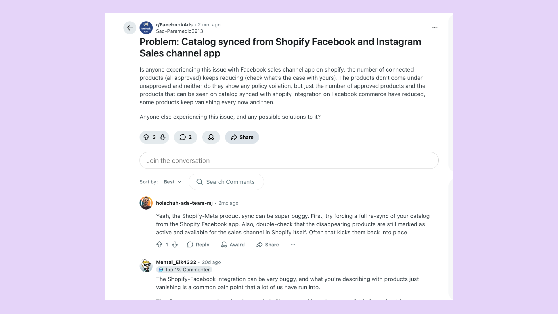 âThe number of connected products keeps reducing⌠some products vanish every now and then.â- A Shopify store owner on Reddit describing Facebook catalog sync issues.