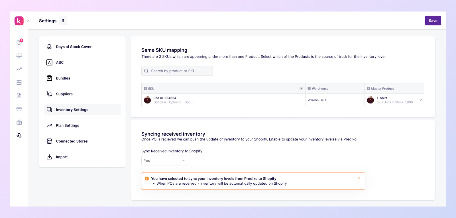 Once a PO is marked as 'Ordered,' Prediko’s system instantly syncs inventory levels with Shopify.
