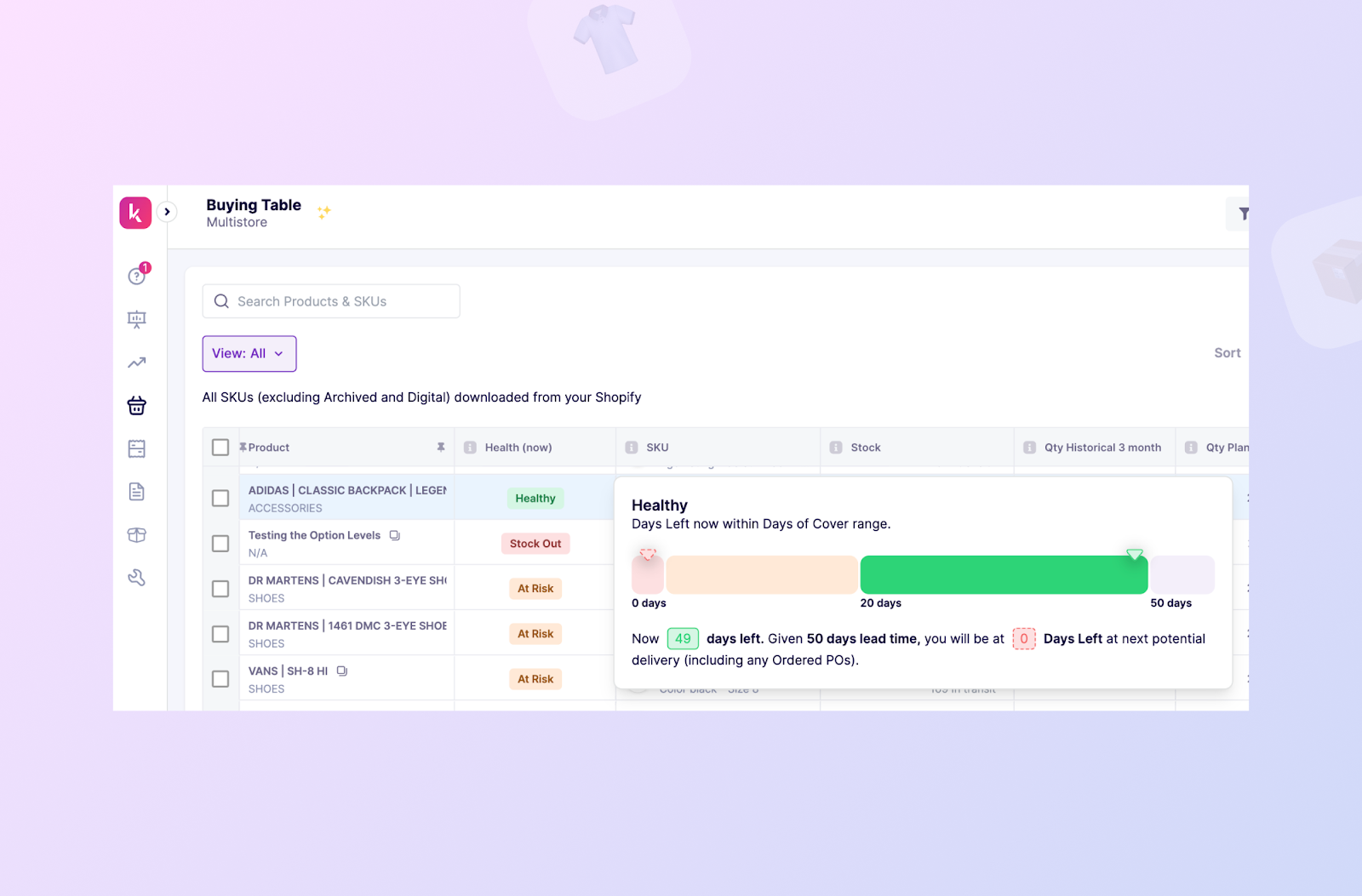 Once a brand instals Prediko from the app store, Prediko syncs their historical sales data and shows the entire product & SKU catalogue in the form of a Buying Table.
