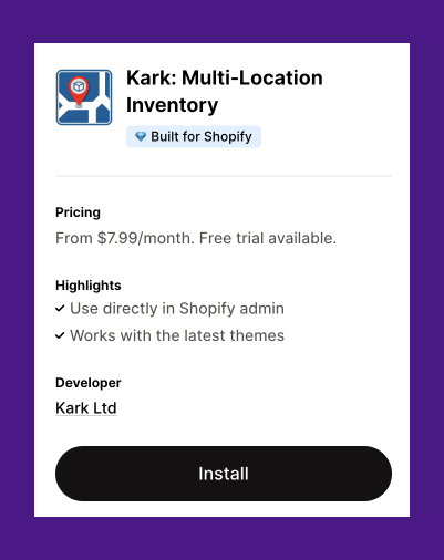 TLDR: Kark Multi-Location Inventory InfoKark allows merchants to display and sync store-specific inventory data using metafields and Geo Search. It’s tailored for businesses needing to reflect accurate stock availability.