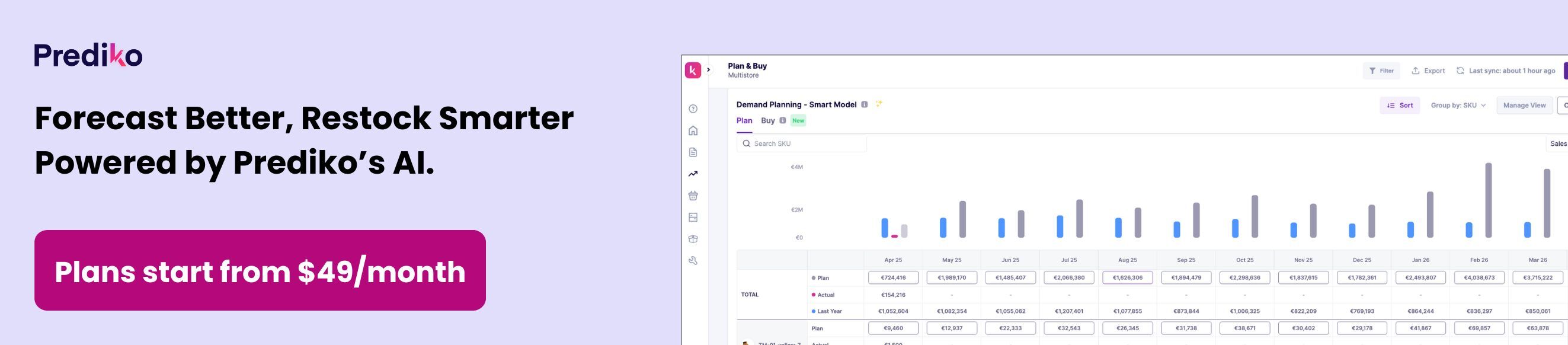 TL;DR: Prediko is built specifically for Shopify brands, offering real-time visibility across stores, AI-powered “To Buy” forecasting per SKU, and smart inventory consolidation across warehouses. Ideal for scaling D2C businesses seeking demand-driven replenishment and central planning