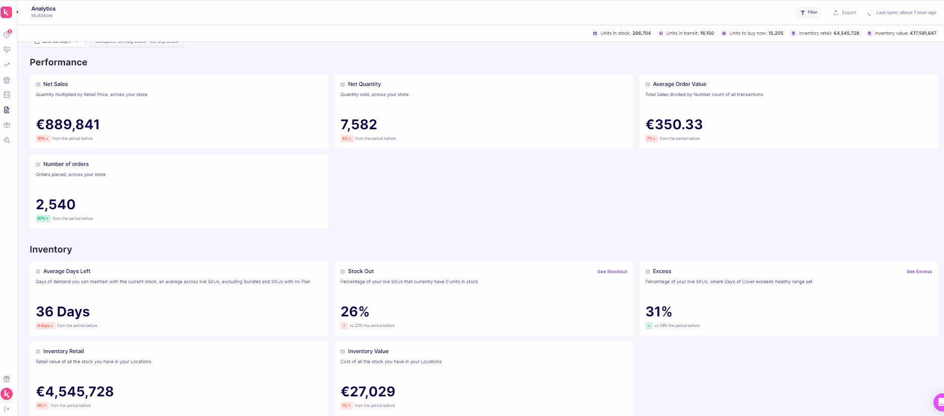 - Its reports and analytics allow you to track your inventory’s retail and total value, showing how much stock is tied up. Prediko also highlights top product performance, tracks due purchase orders, and offers insights for SKU management.