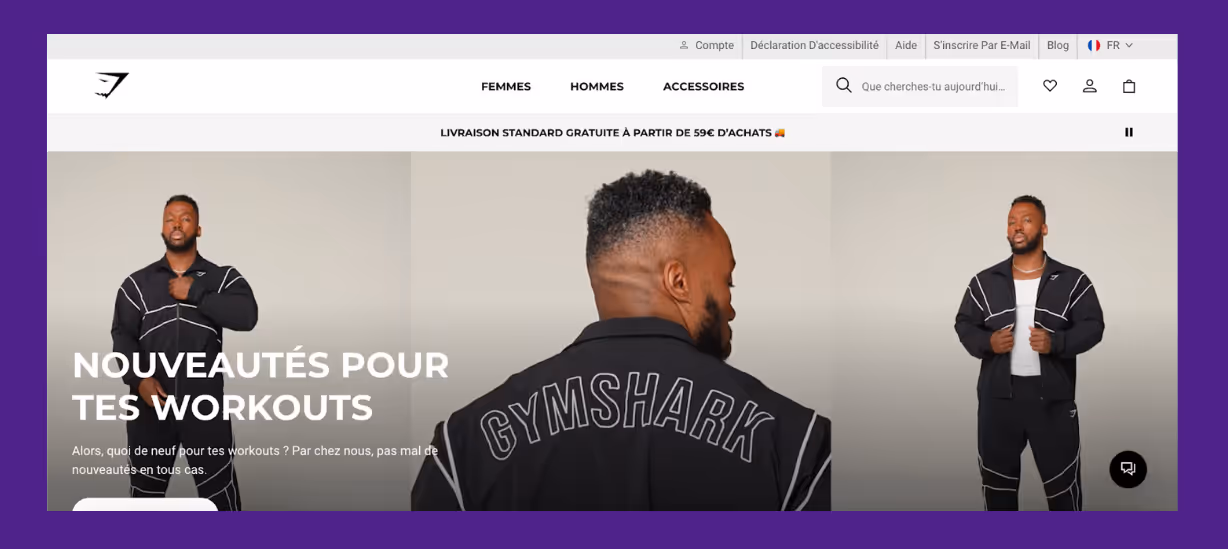 A good example is Gymshark. Their French storefront banner markets new workout drops in local language, catering to everyday fitness needs.