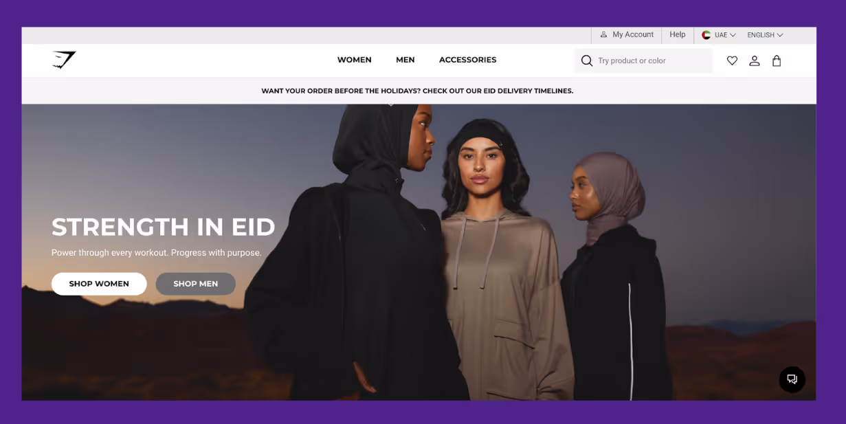 Meanwhile, the UAE homepage promotes a culturally relevant Eid campaign “Strength in Eid,” showcasing modest activewear and dedicated delivery timelines for the holiday.