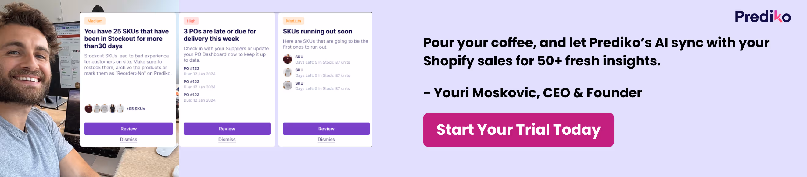 Prediko keeps you informed about which SKUs are at risk or out-of-stock with automated daily and weekly inventory reports sent straight to your inbox.