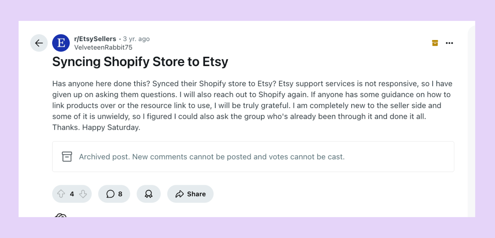 âEtsy support services are not responsive, so I have given up on asking them questions,â shared one frustrated Reddit user while trying to sync Shopify and Etsy.