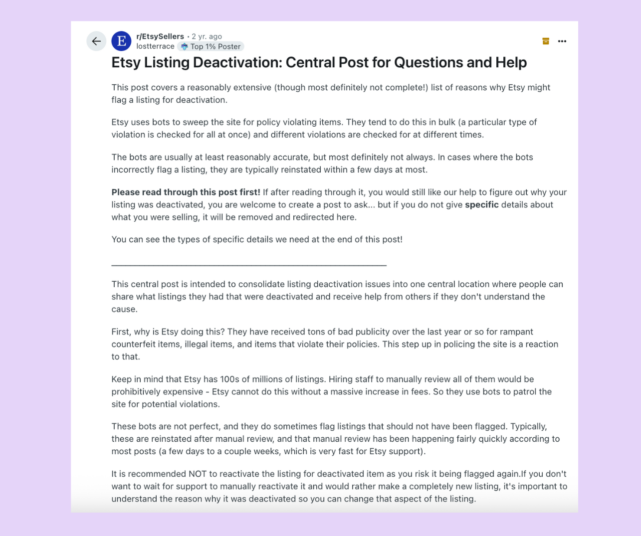 Etsy listing deactivation is a big problem. Big enough for there to be an entire Reddit thread about it.Â
