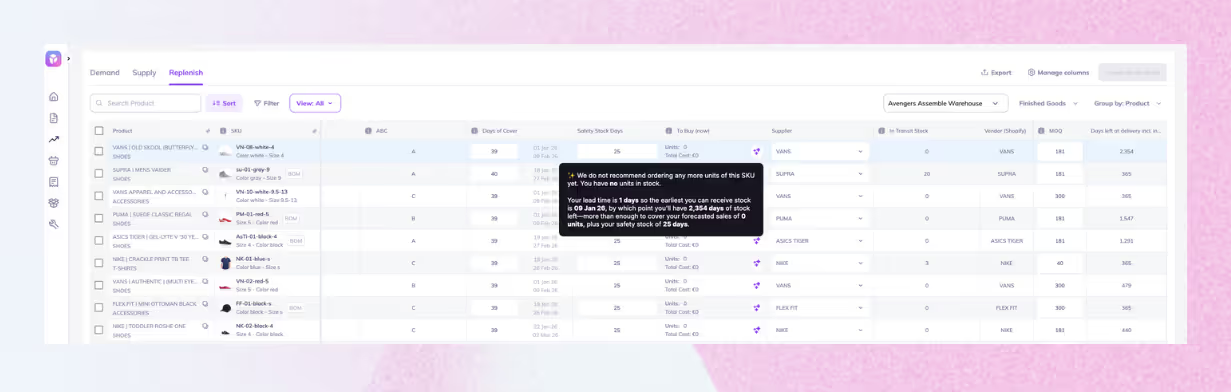 Once the plan is validated in Supply, the Replenish tab becomes pure execution. Teams can create the right purchase orders at the right time with fewer errors, fewer surprises, and less back-and-forth.