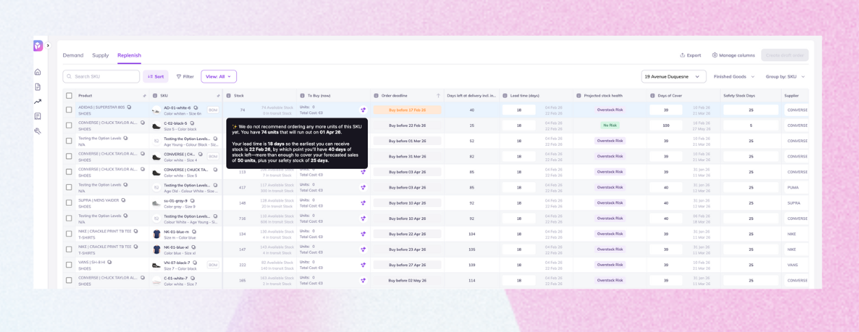 Rather than forcing fixed inventory numbers, Prediko allowed the team to define how many days of coverage they wanted on hand and let the system dynamically adjust as demand changed.