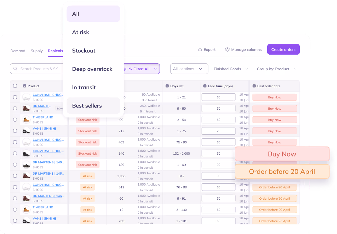 - Get AI-generated automated recommendations for 1000s to millions of SKUs on what to order, when, and how much.