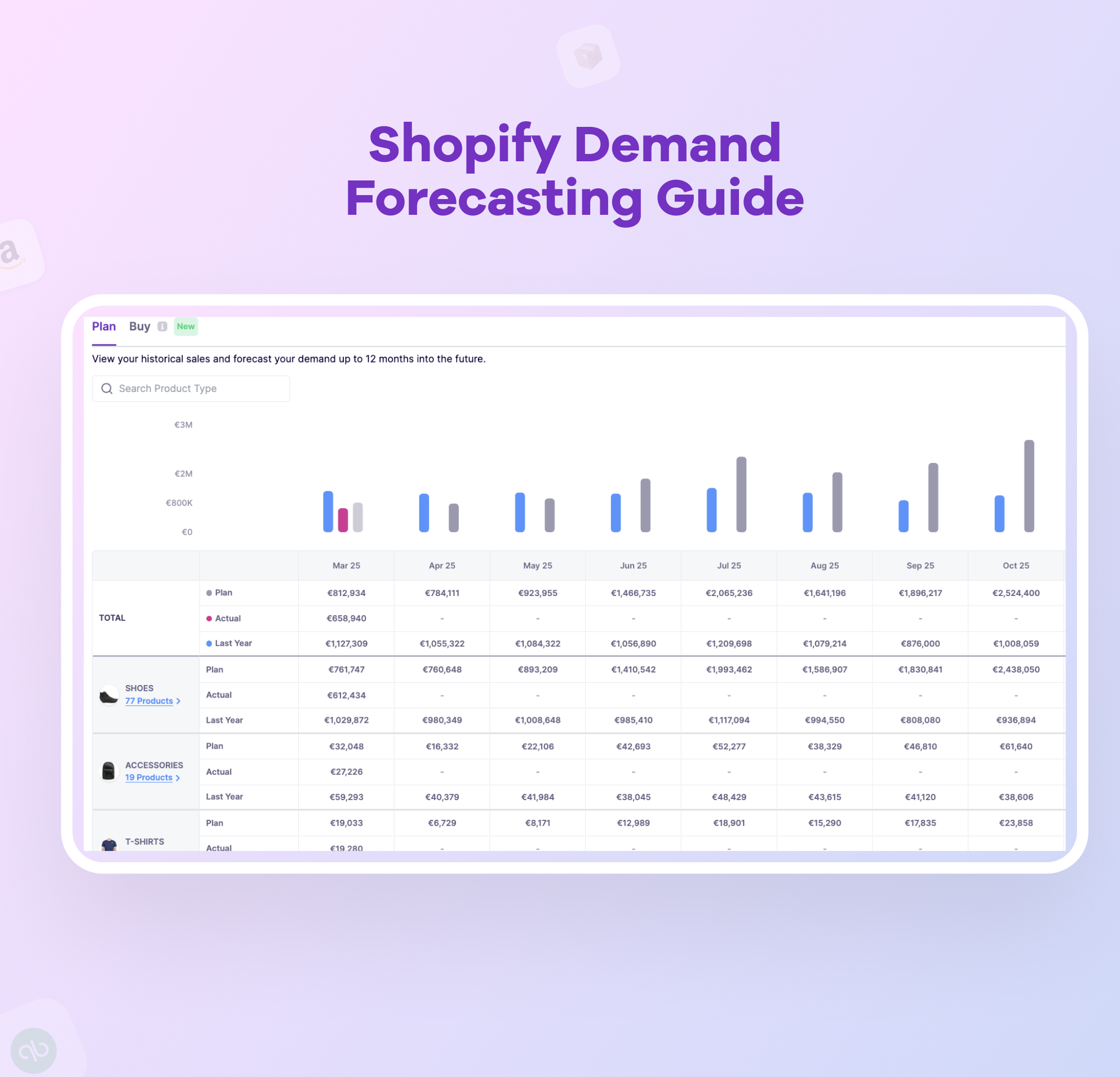 - AI demand planning that forecasts demand by analyzing historical sales, seasonality, and growth. It breaks down your revenue target across 12 months and allocates stock needs by product, SKU, and product type.