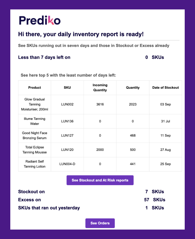 What makes Prediko useful isn’t just the visual and easy-to-consume data. It’s also the way it turns raw inventory data into clear, time-sensitive decisions.