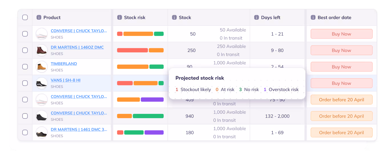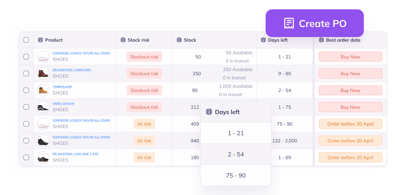 - 1-click to create POs directly based on your cover levels,days of stock, lead time, current sell-through rate and forecasted plan.