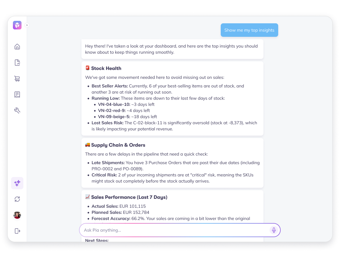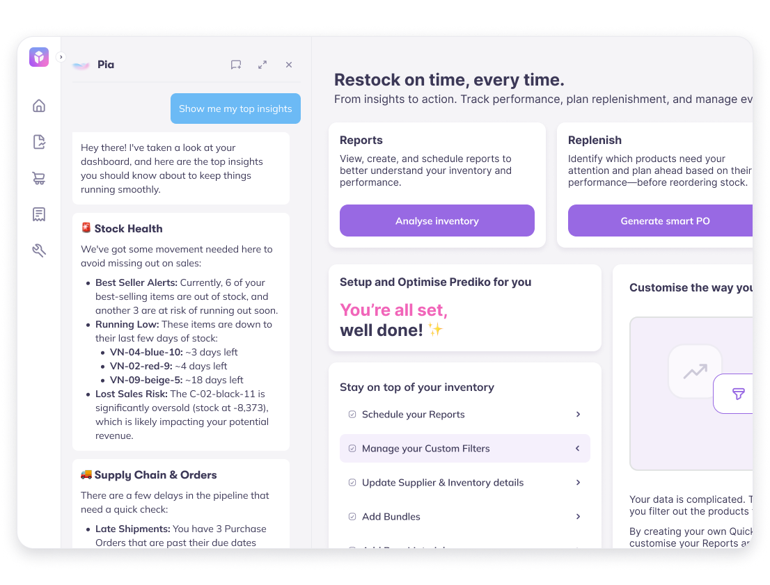 Prediko’s AI agent, Pia, is one of the best agents for inventory, combining insights, forecasting, and actionability.