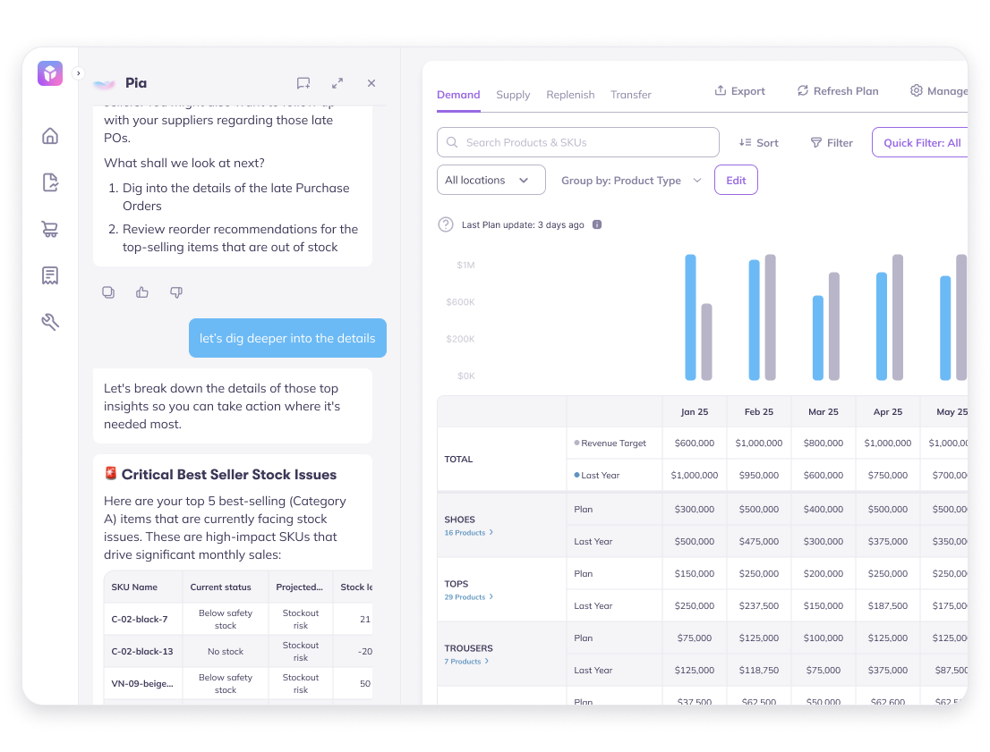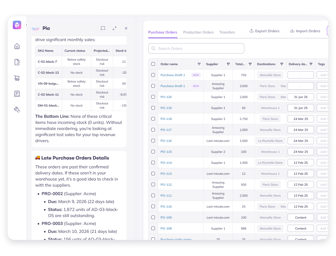 An always-on AI co-worker that deeply scans your inventory data and highlights the most important updates like late POs, stockout risk, and more. Know exactly what to focus on without jumping across dashboards.