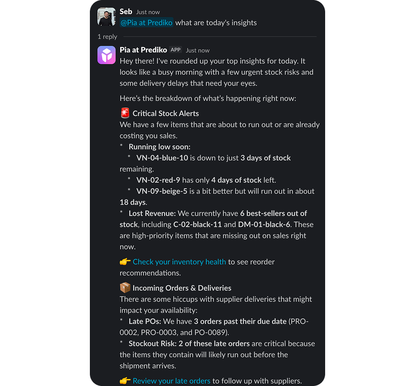 Prediko’s AI agent proactively surfaces and delivers critical inventory updates daily, without the need to check dashboards or run reports. Get scheduled insights for