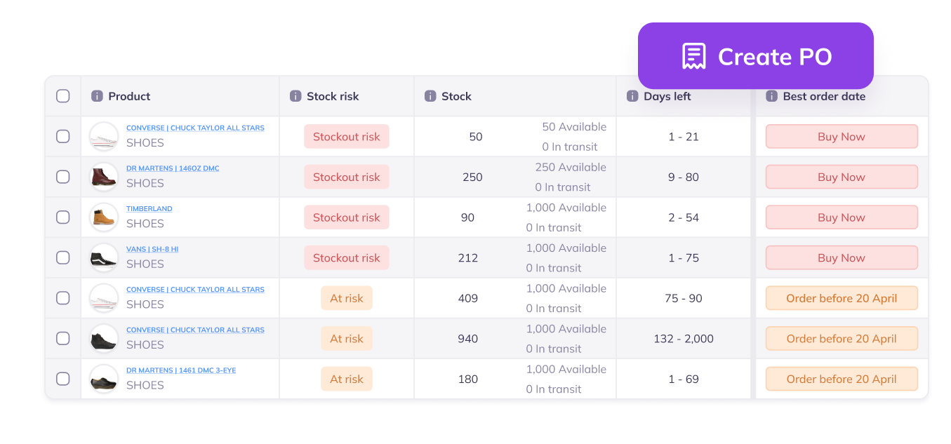 - Create POs directly from the Buying Table using “real-time” suggestions generated by Prediko.