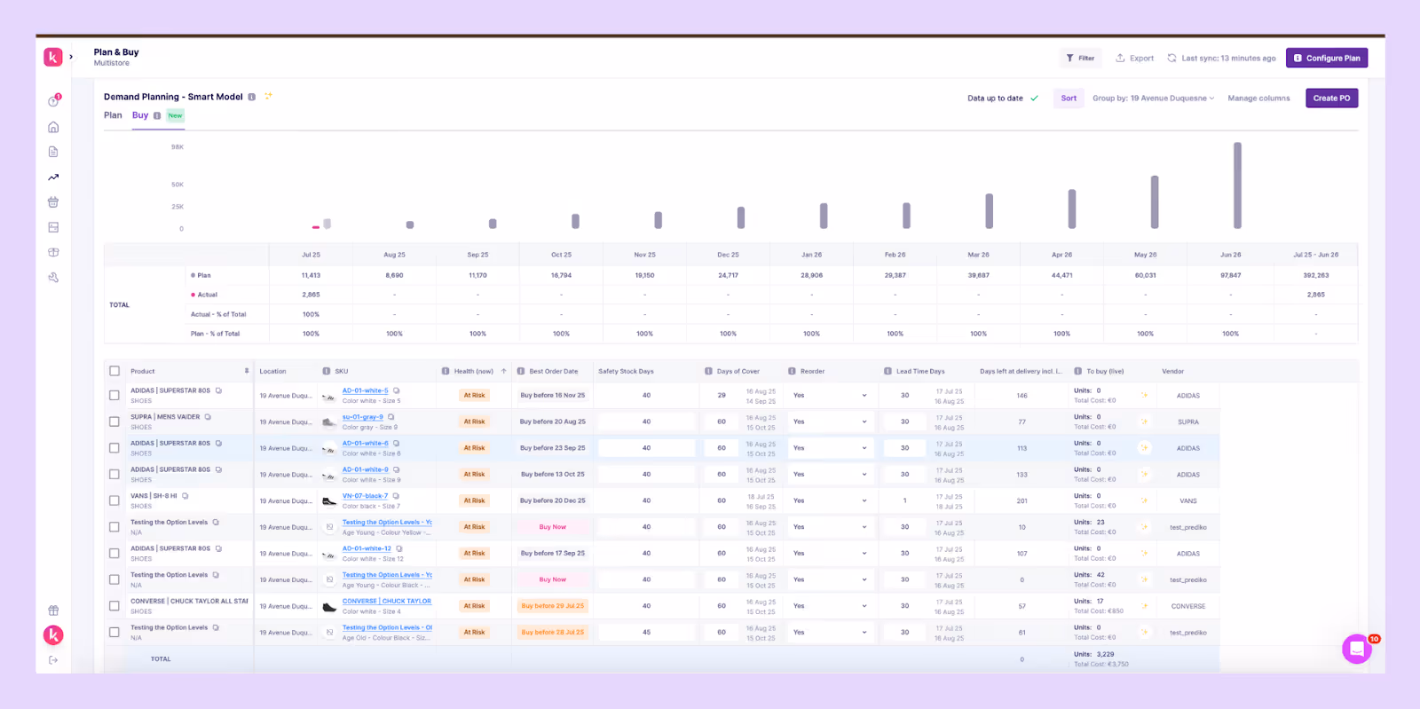 With Prediko, plan inventory by location. Its AI algorithm takes into account store-level demand, supplier lead times, and sales velocity, so you always know what to stock, where, and when.